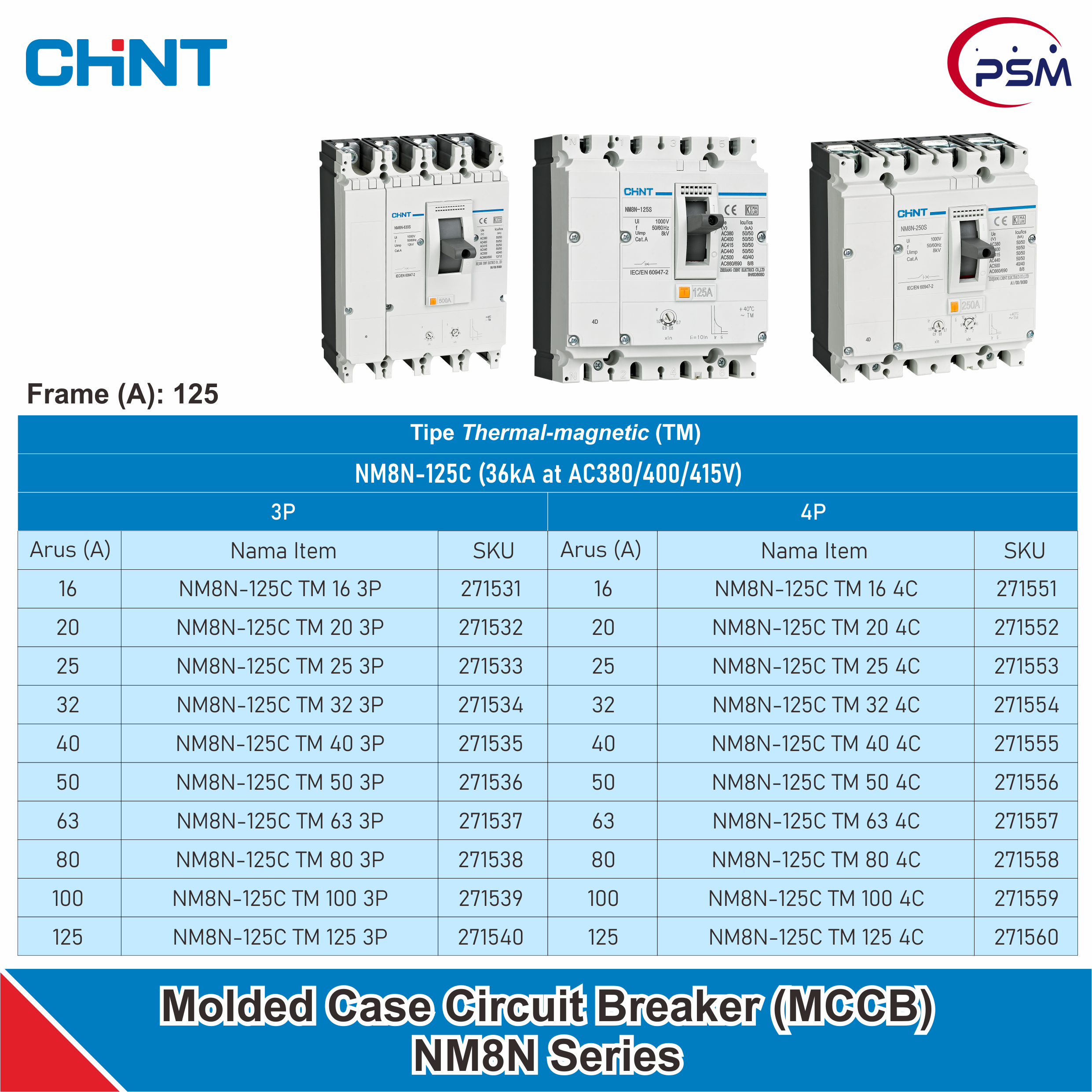 CHINT NM8N Series / Molded Case Circuit Breaker (MCCB) / Thermal Magnetic (TM) / 16A-125A Performa C/36kA/3P & 4P