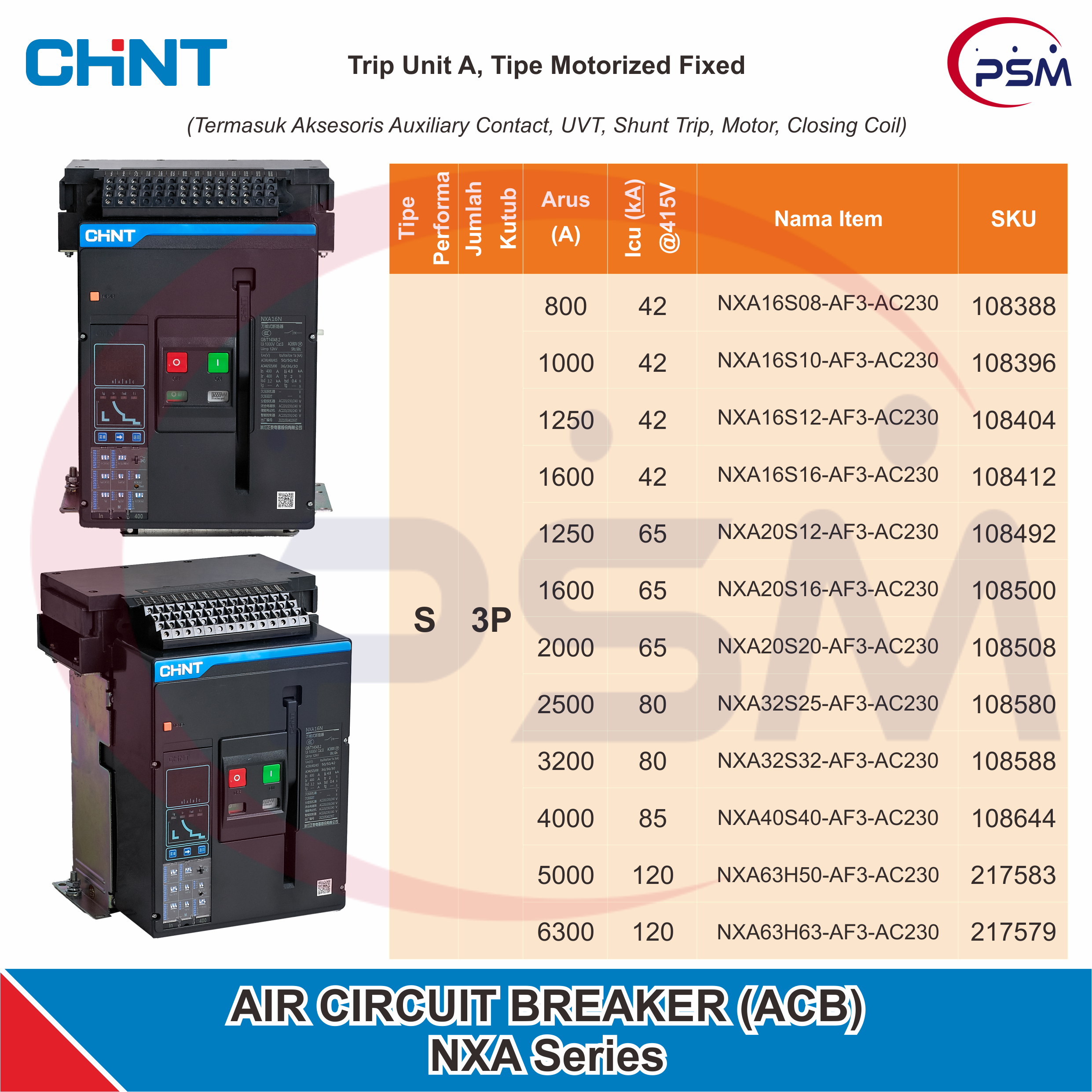 Varian Produk dan Harga NXA Series Trip Unit A, Tipe Motorized Fixed Performa : S / 3P