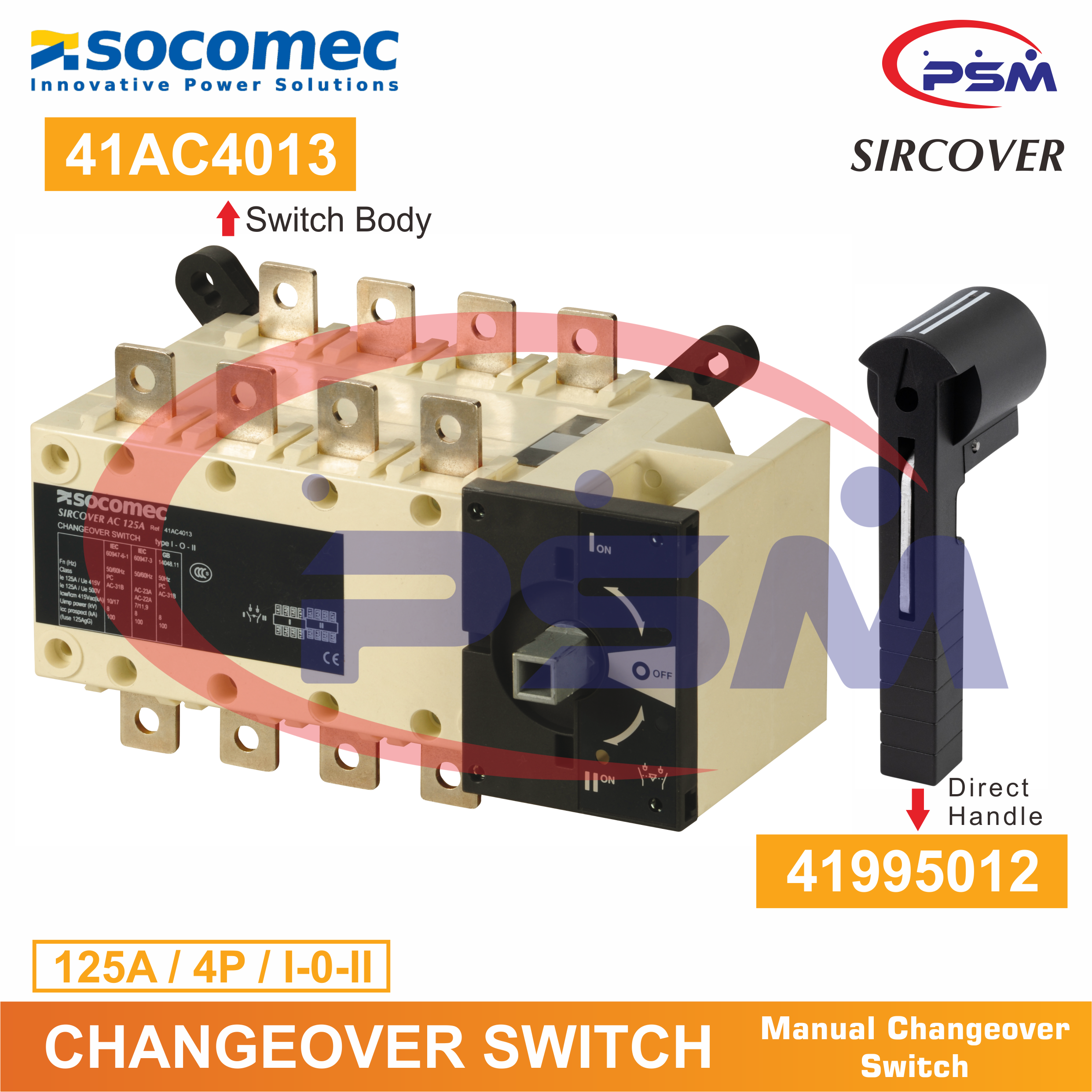 Socomec Sircover Manual Changeover Switch 125A 4P I-0-II w. Direct Handle / 41AC4013 + 41995012